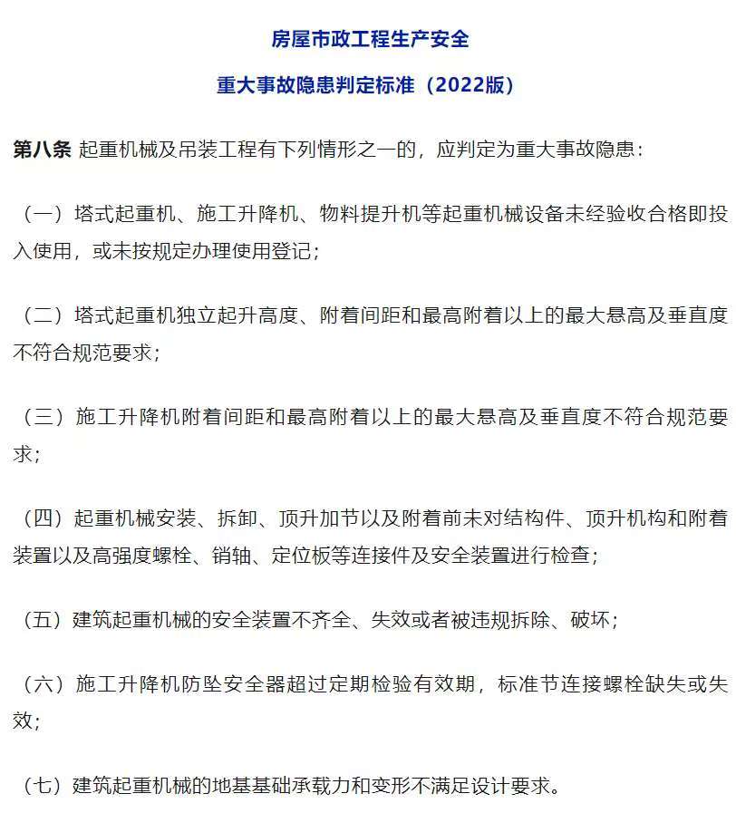 据事故调查报告,该起事故是一起违规进行高空塔机拆除作业导致的生产安全责任事故。在起重机械及吊装工程中出现哪些情形应判定为重大事故隐患一起来看!